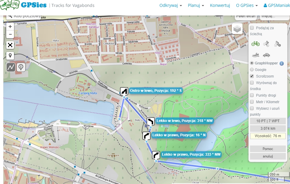 Przy drugim podejściu skorzystałem z opcji "podążaj za ścieżką" w efekcie dostałem ślad o długości ok. 150 pkt oraz ok. 20 punktów zwrotu. Tym razem już na ekranie mapy zauważyłem nazwy punktów typu: "lekko_w_le":