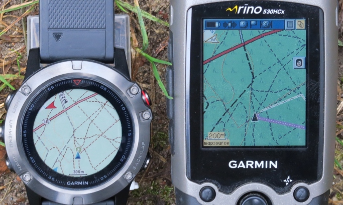 Na fotce porównanie Fenixa 5 z Rino 530Hcx, których parka, w przeciwieństwie do mojego Oregona, nadal ma się dobrze i od czasu do czasu bywa wykorzystywana. Zwłaszcza w sezonie grzybowym, w Puszczy Noteckiej, gdzie brak zasięgu GSM, a gdzie moja lepsza połowa lepiej się czuje, wiedząc że mam ją w zasięgu "wzroku" (czytaj: zasięgu Garmina):