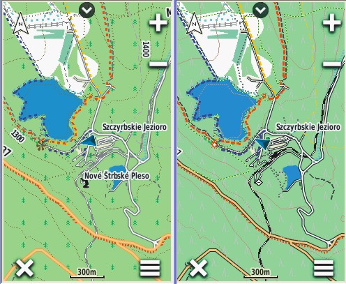 (przynajmniej moim zdaniem) w Etrexie, w Oregonie zawodzą. Jeżeli chodzi o zieleń etc.ciągle jestem daleko w polu i nie wiem na ile obecna wersja kolorystyki sprawdzi się w terenie, a na ile będzie wymagała korekty. Za to sprawa "twardego" rysowania krawędzi dróg